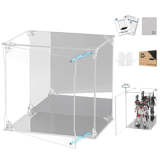 KUKER フィギュアケース アクリル 台座ミラー 背面ミラー マグネット式 磁石付き 前扉 コレクションケース より堅固 組み立て式 アクリルケース ディスプレイケース 防汚れ 手袋 クリーニング クロス付き