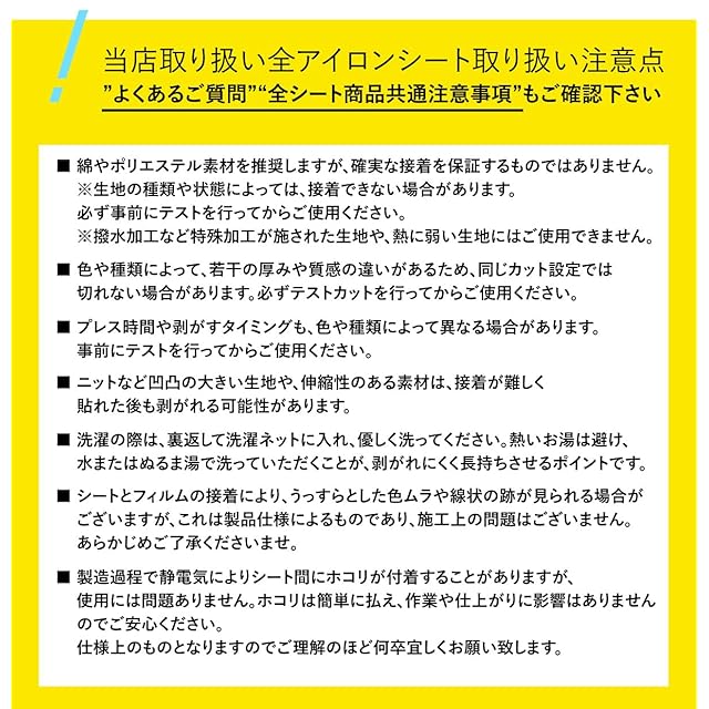 ●ニットなど凹凸や伸縮性のある生地は接着しにくく、剥がれる可能性があります。●洗濯は裏返してネットに入れ、熱湯を避け水またはぬるま湯で優しく洗うと長持ちします。●シートとフィルムの接着により色ムラや線状の跡が出る場合がありますが、仕様によるものとなります。●ご使用はお客様の判断と責任でお取り扱いをお願いします。●ご不安な方は約A4サイズの商品からお試しご確認ください。
