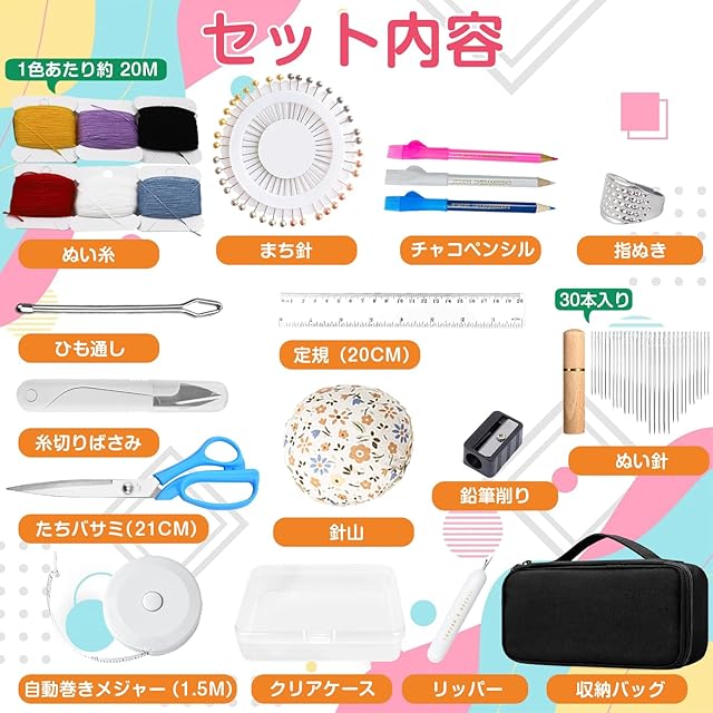 【裁縫に必要なすべて】この裁縫セットには、基本的な修理を行うために必要なすべての道具が含まれており、家庭や旅先での日常の縫製ニーズを解決します。当社の針と糸のキットには、さまざまな色の糸*6、まち針、針通し*3、チャコペンシル*3、ひも通し、定規(20CM)、糸切りばさみ、指ぬき、ぬい針(30本入り)、たちバサミ(21CM)、針山、鉛筆削り、自動巻きメジャー(1.5M)、クリアケース、リッパー、収納バッグ付属しています、ソーイングセット。