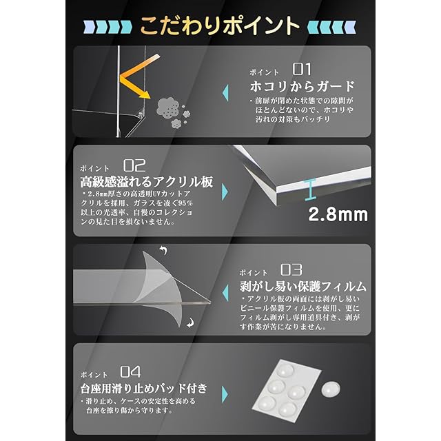 ✅【UVカット99.5%】フィギュアの見た目を損ない厚さ2.8mm UVカットアクリル素材を使用。日焼けによる変色、劣化、色褪せを防ぎ、大切なコレクションを紫外線によるダメージから守ります。※第三者機関にて試験済み