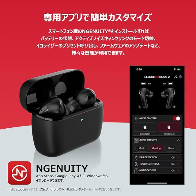 HyperX Cloud MIX Buds 2 ノイズキャンセリング トゥルーワイヤレスイヤホン Bluetooth 超低レイテンシ20ms 2.4 GHz 最大26時間バッテリー駆動 2年 7D0A4AA | Trend Design BASE店