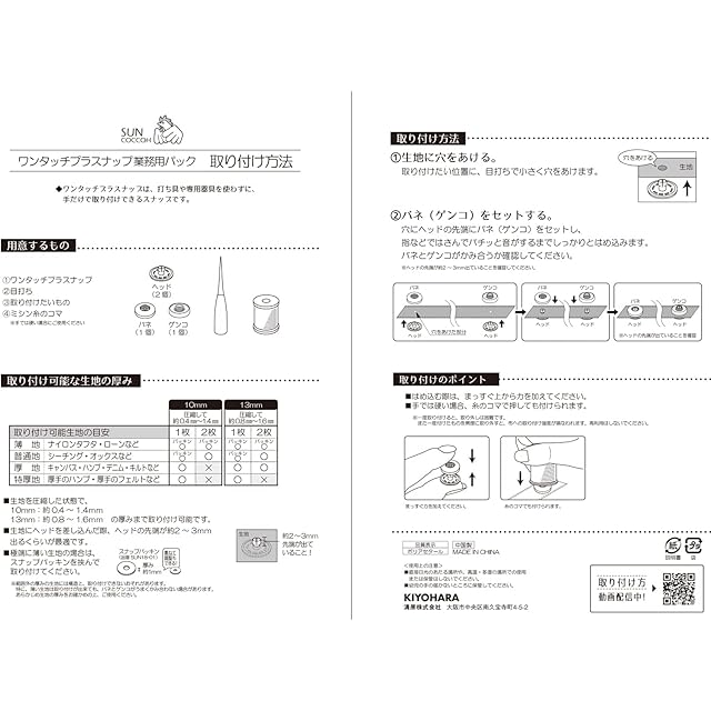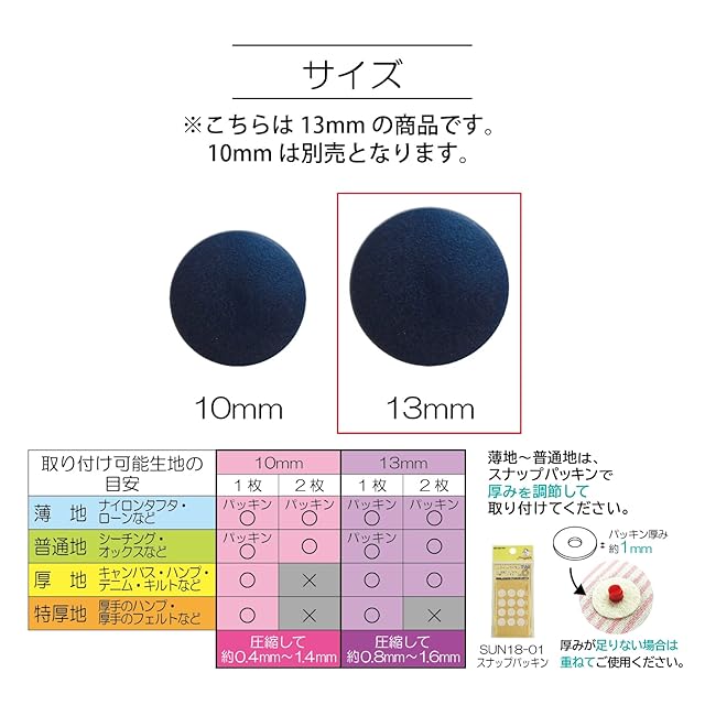 ご注意:厚すぎる生地にはうまく取り付けができません。薄地~普通時に取り付けたい場合は、スナップパッキン(品番:SUN18-01)で厚みを調節して取り付けてください。