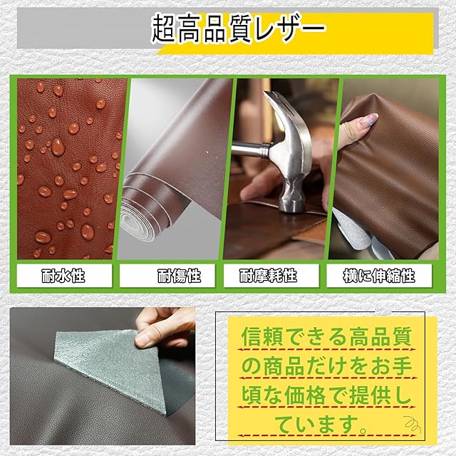 【使用方法】第1ステップ:損傷した表面を清潔に保つ、第2ステップ:必要に応じて適切なサイズを切り出す、第3ステップ:革パッチの裏地紙をはがす、第4ステップ:貼り付けた後に力を入れて押して24時間待ち、全部完成、こんなに楽!注:サーフェスに使用する場合は、エッジに接触しないようにコーナーを丸めてください