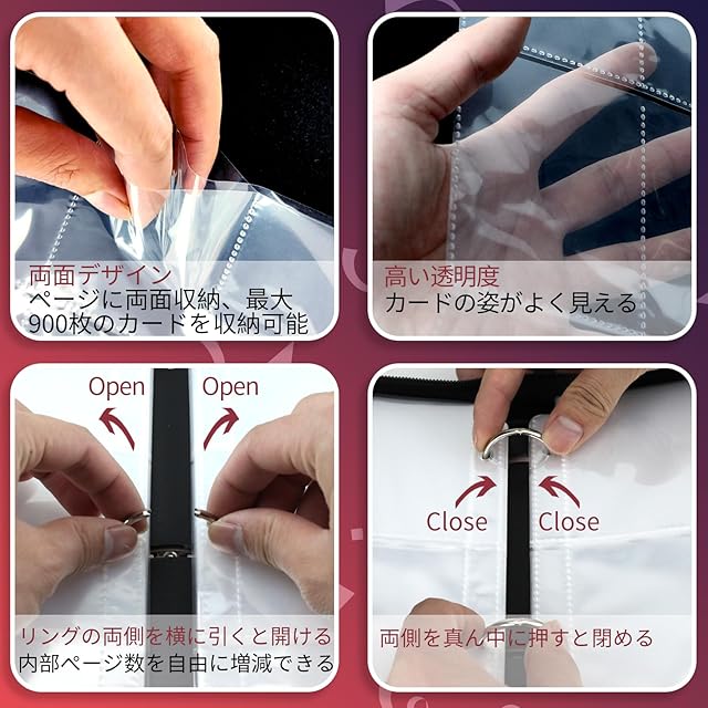 【超大容量900枚収納可能】 バインダー両面使用タイプ50枚付き(両面で100ページあります。)1ページには9枚のカードを収納できます。100ページで最大900枚まで収納でき、カードの挿入と取り外しが簡単です。カードを収納するのが楽しくなります。内部リングは3つあり、内部バインダーの数を自由に増やしたり変更したりできます