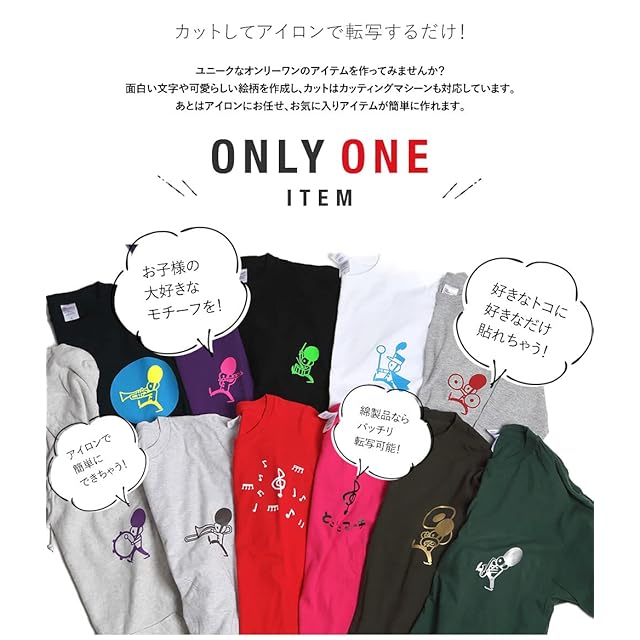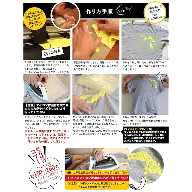 【サイズがぴったりサイズではございません。少し長めにカットします。】綿やポリエステル素材を推奨しますが、確実な接着をするものではありません。※生地の種類や状態によっては、接着できない場合があります。必ず事前にテストを行ってからご使用ください。※撥水加工など特殊加工が施された生地や、熱に弱い生地にはご使用できません。・色や種類によって、若干の厚みや質感の違いがあるため、同じカット設定では切れない場合があります。必ずテストカットを行ってからご使用ください。またプレス時間や剥がすタイミングも、色や種類によって異なる場合があります。事前にテストを行ってからご使用ください。 ■使用方法 1)予めデザインが完成したものをカットする道具が必要です。はさみ、カッター、カット板、(お持ちの方はカッティングマシーン)などご用途に合わせてご準備ください。熱転写するのでシリコンシートもご用意ください。(”シリコン樹脂”のクッキン グシートなどでOK!) 2)予め作っていたモチーフデザインをカットします。転写時反転させますので、カットする際は反転して作成します。光沢がある面が剥離フィルムになります!裏側をカットして下さい! 3)不要部分を剥がします。透明の剥離フィルムに余分な物が付いていないように、しっかりとカス取りします。 4)キレイに取り除いたら、転写するTシャツとともに、デザインしたシートを透明の剥離フィルムが上になるように、アイロン台の上にのせてバランスをとります。 5)デザインしたシートの上にシリコンシートを載せて、アイロンを150℃~160℃ほどで10~20秒ほど、プレス気味に全体にしっかりとあてます。※アイロンによっては凹凸があるものもありますのでご注意ください。しっかりとあたっていないと、貼り付けることができません。※推奨アイロン温度は、150°~160°になります。(アイロンは弱、中、強などの表示となるかと思いますが、お使いのご説明書などやメーカーにてご確認くださいませ) 6)熱いうちに透明の剥離フィルムを剥がします。時折、剥離フィルムにくっつく場合もありますので、ゆっくり様子を見ながらお剥がしください。環境や熱、貼るものにより、熱が冷めてからのほうが剥がしやすいこともございます。[ワンポイントアドバイス] フィルムを剥がした後に貼り付きが悪く少し浮いてしまった場合は、シリコンシートを再度載せ、アイロンをかけてあげると生地にくっつきます。 7)キレイに圧着出来ていたら完成!転写したシートに繊維の凹凸感が出ていたらバッチリです! オリジナルTシャツやパーカー、バック、イベント用品などが簡単に作れる、アイロンシート になります。