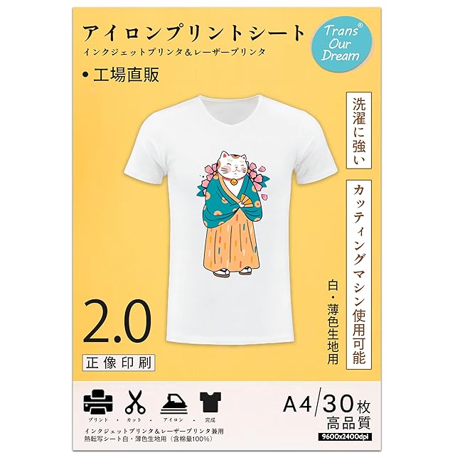 TransOurDream 真正の転写シート アイロンプリントシート 白・薄色生地用 A4 30枚 転写紙 アイロンプリントべーパー アイロンプリント用紙 Tシャツ転写紙 洗濯に強い 使用簡単 正像印刷 JP-2-30 | Trend Design BASE店