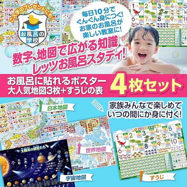 商品名:お風呂の学校 セット価格 地図/すうじのひょう(恐竜)お風呂ポスター2種類セット 日本製 地理 数字 文字 お受験 社会 学習 知育 B3サイズ 防水