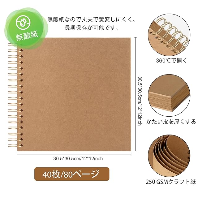 【丈夫な材質】カバーはハードボール紙を採用しており、インナーページは厚手のクラフト紙で作られ、手触りがよくて耐久性に優れ、長期保管に最適です。耐久性のある360度の金属コイルのデザインは美しく、レトロでファッショナブルで、アルバムのページが落ちることを心配する必要はありません。