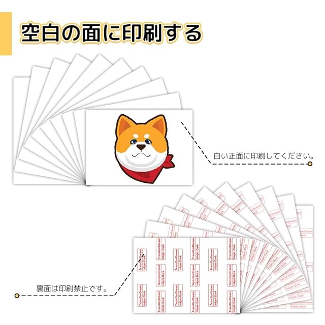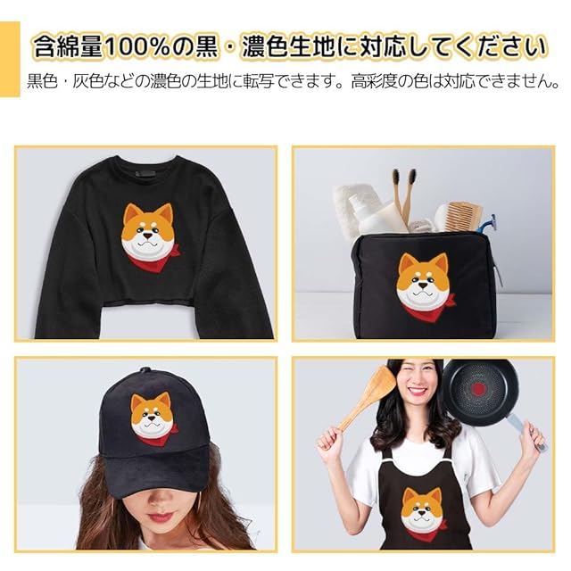転写できる生地:含100%綿の黒・濃色生地&白色・薄色生地 *本製品はインクジェットプリンター専用紙です。 *絵柄以外の部分は白色で布に転写されますので、絵柄のみを転写したい場合は、余白部分は切り取ってください。