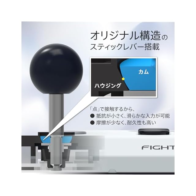 オリジナル構造のスティックレバー搭載。ホリが独自開発したカムとハウジングが「点」で接触する構造です。