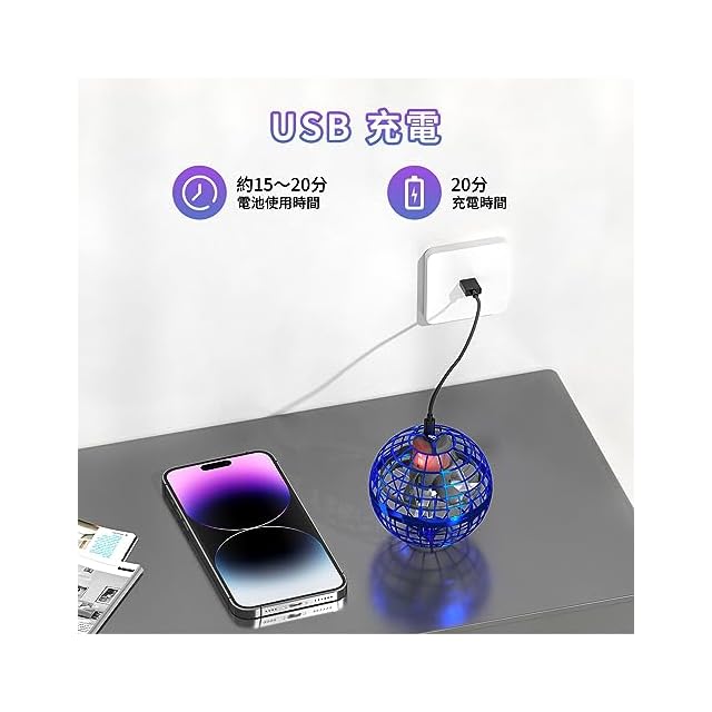 [USB急速充電] ボール本体をUSBポートに接続するだけで、25分でフル充電される。(使用時間:8~10分)。LEDインジケーターが点滅したら、この楽しいものは充電が必要だということ。充電中はインジケーターが点灯したままになり、充電が完了すると消灯する。