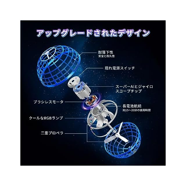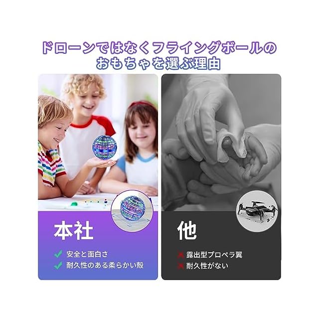 [スマート保護] このサスペンションボールは高密度のメッシュと完全なケージで設計され、高品質ABS材料で作られ、柔軟で、軽量で落下防止性がある。プロペラが密閉されているので、お子様が翼で怪我をする心配がない。ブーメランボールのおもちゃが壁などにぶつかると、自動的に運転を停止する。