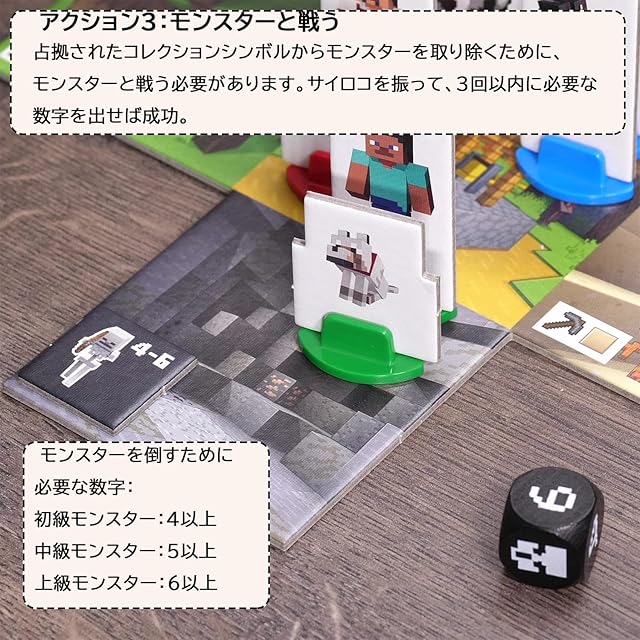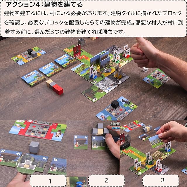 遊び方:2~4人のプレイヤーが協力して、バイオームを探索し、重要な資源を集めて村を再建しましょう。危険なモンスターと戦って占拠されたコレクションシンボルからモンスターを取り除きます。邪悪な村人が村に到着する前に3つの建物を完成させれば、みんなの勝利となります。