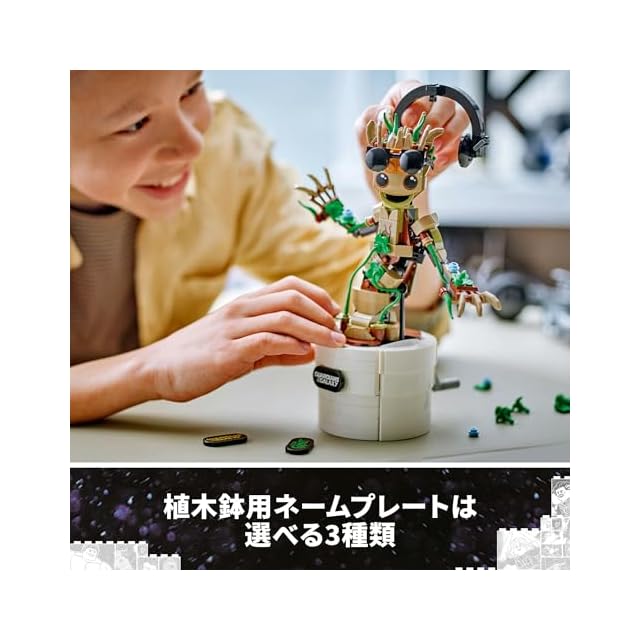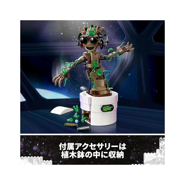 踊るスーパーヒーロー – 植木鉢に入った「グルート」の可動フィギュア、ネームプレート3種、各種アクセサリー(ヘッドホン、サングラス、予備の葉っぱなど)