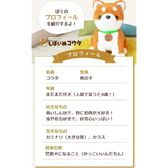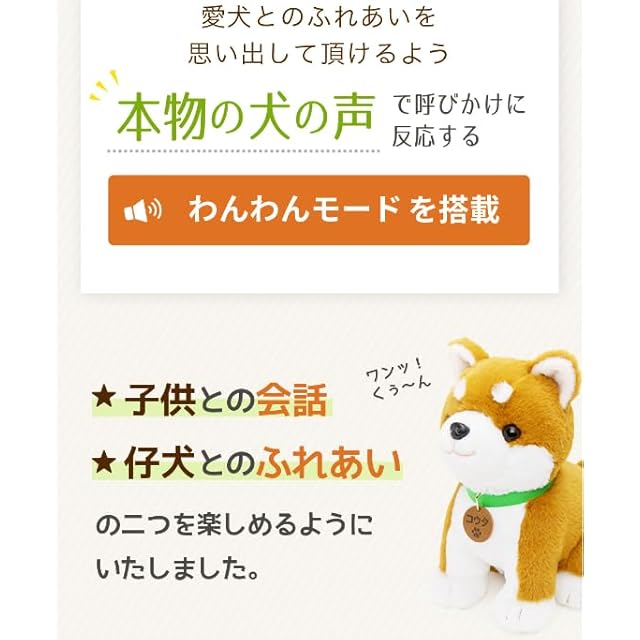 【シニアの方のおしゃべり相手に最適!会話ができる柴犬のぬいぐるみ】 ★ お好みに合わせて「おしゃべりモード」 「わんわんモード」の切り替えができます。<br> ★ 4歳の男の子、または、仔犬の声であなたの言葉に反応する国内唯一の音声認識ぬいぐるみ。 <br> ★ 日常の寂しさから『ペットを飼いたい』と思っていても、ご高齢になるほど世話をする事を負担に感じ、 断念をしてしまう事が非常に多くあります。『しばいぬコウタ』はそうしたもどかしさを解決するため生まれました。 ★ 難しい操作もいらず、トントンして話しかけるだけ。シニア方でも簡単にお楽しみいただけます。 ★ また、『ワンワンモード』を搭載し、『子供との会話』『仔犬とのふれあい』の二つを楽しめるようにいたしました。 ★ しばいぬコウタとのインタラクティブな生活をお楽しみください。 <しばいぬコウタのポイント> ● 4才の男の子/仔犬の可愛い声が心に響きます。 ●トントンして話しかけるだけの簡単操作。 ● 時間を教えてくれたり、時には「詐欺の電話に注意して」と語りかけてくれます。 ● ワンちゃん目線の、思わずクスっと笑えるバラエティ豊かなひとり言。 ● 季節の微妙な変化や時間の経過に応じて話す内容が変化。 ●『犬』にまつわる歌から、親しみやすい童謡まで、全30曲を一生懸命歌います! ● ずっと撫でていたい、柔らかい触り心地。 ● 夜21時~翌朝8時までは、触らない限り静かにしています。 ● 話す言葉は約1000ワード。 *コウタの声の大きさは4段階で調節出来ます。