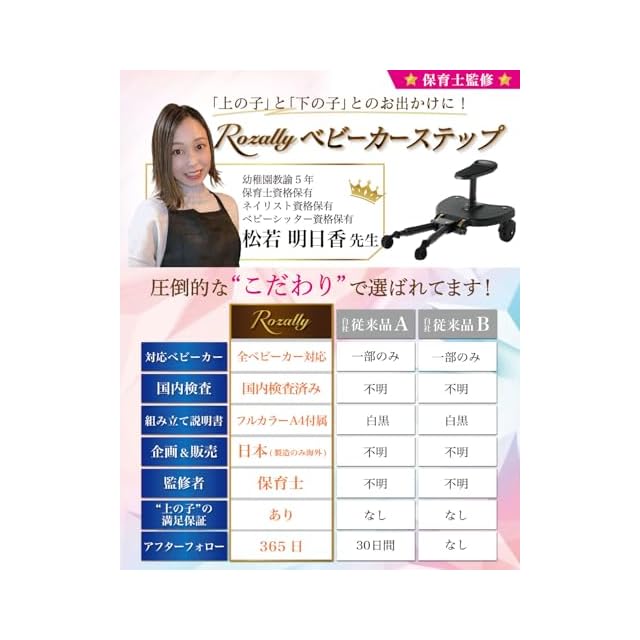 【保育士が監修】 Rozally ベビーカーステップ がついに正式販売開始。下の子 が生まれたから ベビーカー で お出かけ という時に 上の子 が自分もベビーカーに乗りたいと喧嘩になってしまった…という声から生まれた バギー ボード 型の 接続 ステップになります。サドル付き の ステップボード になっているので 上の子 も一緒に 座れる モデルになっています。企画&設計では【保育士】の先生からアドバイスをもらい、分かりやすい取扱説明書を添えて製品化しました。