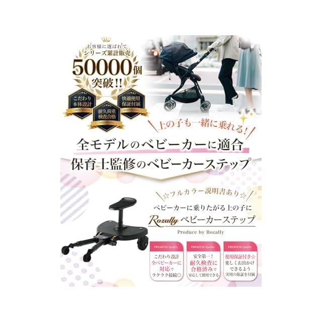 【保育士が監修】 Rozally ベビーカーステップ がついに正式販売開始! 下の子 が生まれたから ベビーカー で お出かけ という時に 上の子 が自分もベビーカーに乗りたいと喧嘩になってしまった…という声から生まれた バギー ボード 型の 接続 ステップになります。 サドル付き の ステップボード になっているので 上の子 も一緒に 座れる モデルになっています。 企画&設計では【保育士】の先生からアドバイスをもらい、分かりやすい取扱説明書を添えて製品化しました。 【こだわり】様々なメーカーから” ベビーカーボード ”や” バギーボード ”として 接続式の ベビーカー ステップ が販売されていますが、Rozallyの ベビーカーステップ は”こだわり”が一味違います。 ベビーグッズ や 育児用品 などをメインに取り扱っている10社以上の工場からサンプルを取り寄せ、 「全ベビーカーに 取り付け できる事」や「組み立てやすさ」を、 一緒に試行錯誤して頂けた1社に絞って発注を行なっています。 【全ベビーカーに対応】 各メーカーから 二人乗り の 取り付け アダプタ として純正品の オプションボード として販売されている場合もありますが、 補助ペダル がしっかりしていなかったり、 サドル が付いていなかったりとバラバラな仕上がりになっています。 Rozally ベビーカーステップ は、全モデル対応はもちろん、 機能性もこだわりを持ってベビーカーステップの機能性に特化して製品化しました。 【対応ベビーカーのリスト】 [日本語] 「アップリカ」 「コンビ」 「クイニー」 「ニューウェルブランズ・ジャパン」 「グレコ」 「エアバギー」 「リッチェル」 「ピジョン」 「グッドベビー」 「コンビ」 「ホワイトレーベル」 「五十畑工業」 「エンドー」 「日本育児」 「サイベックス」 「ベビーゼン」 「バガブー」 「ストッケ」 [英語] 「aprica」 「Combi」 「Quinny」 「GRACO」 「AirBuggy」 「Richell」 「pigeon」 「Goodbaby」 「Combi」 「WHITE LABEL」 「NIHONIKUJI」 「cybex」 「BABYZEN」 「Bugaboo」 「STOKKE」 お客様からの対応しているか問い合わせとして多いメーカー様を記載させて頂きました。 その他メーカーのベビーカーに対応しているかご不明な場合は、 お気軽に問い合わせをお願い致します。 ※組み立ての前に付属の説明書を読んでください。【製品のメーカー】 Rozally ベビーカーステップ は品質にこだわり、 工場と交渉をおこなって素材選定から進めています。 出荷前の検品などは十分に行わせて頂いているのですが、 輸送中に破損や汚れは混じってしまうケースがあります。 万が一の不具合などが発生してしまった場合でも、すぐに交換品の手配をさせて頂きます。