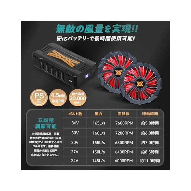 商品名:【2025最新暴风超強力出力36V/20000mAh】空調作業服 ファンバッテリーセット 36V超高出力 20000mAh バッテリー 5段階風量調節 超静か 長寿命 急速充電 空調ファン耐水防塵 90mm服穴径対応 熱中症対策 猛暑対策 男女兼用 PSE認証済(TYPE 1)