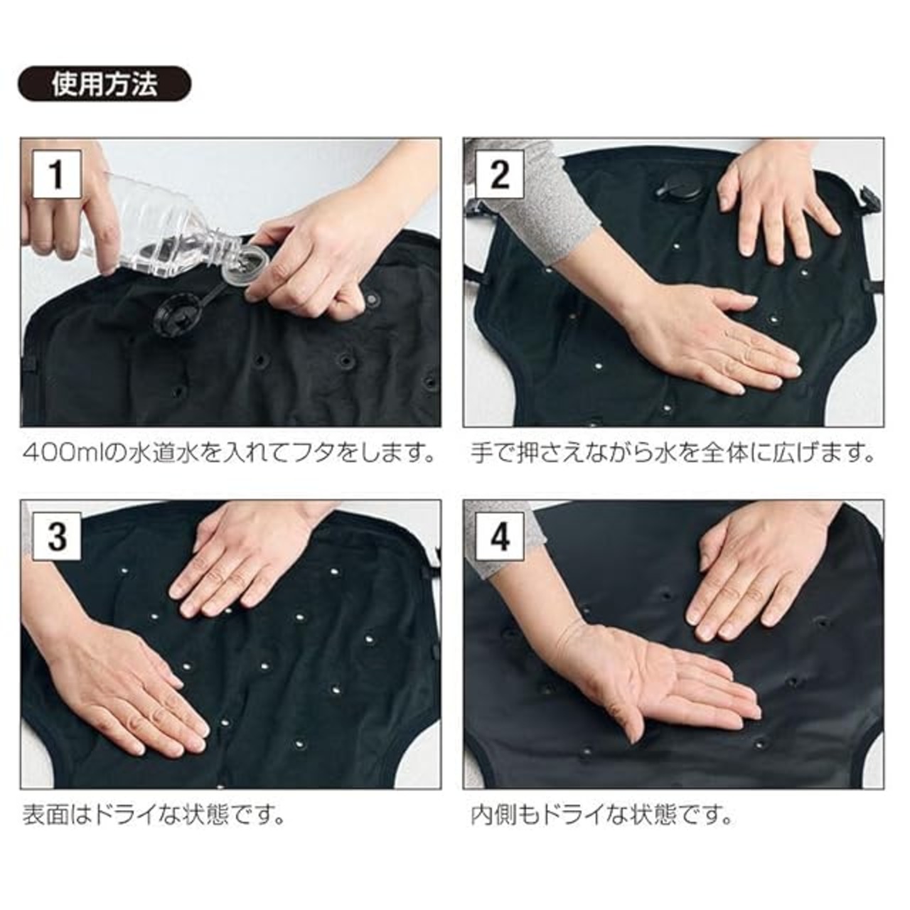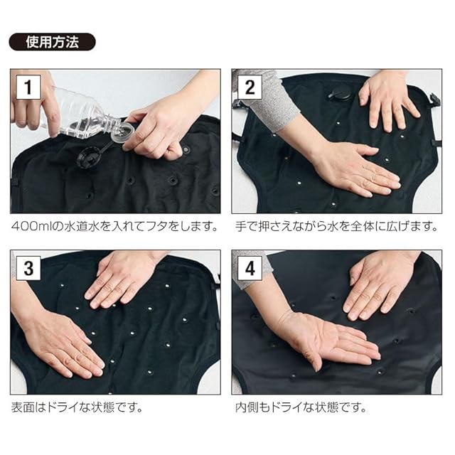 冷却持続時間は約3-4時間で、水があれば何度でも再使用可能。