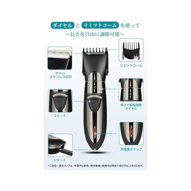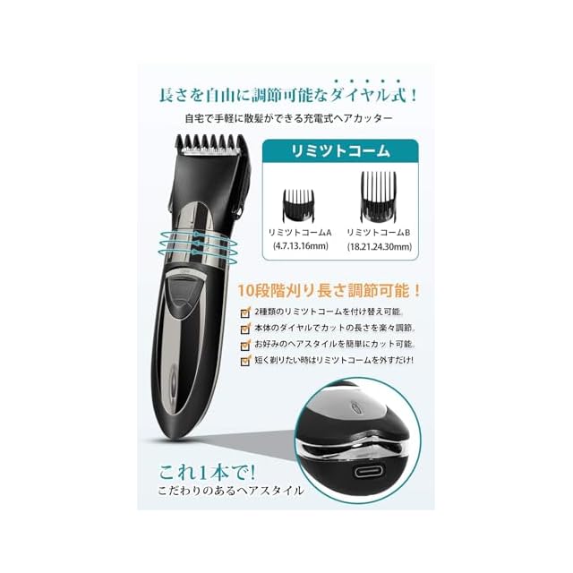 商品名:電動バリカン ヘアーカッター バリカン メンズ IPX7防水 ヘアクリッパー Type-c 充電式 リミットコーム付きで 10段階調節可能 散髪用 ショートヘア用 子供用 家庭/業務用 取り外し可 水洗い可 プロ仕様 日本語説明書付き