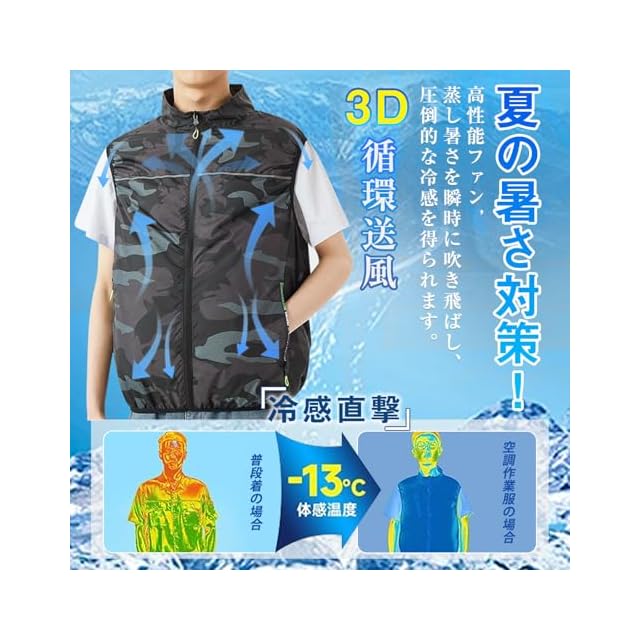 【多目的使用、洗える冷却服】夏に適する薄手の生地で作られているので、軽くて快適!また、ルックスがシンプルなベストはメンズもレーディスも着用できる!ファンやケーブルを外して丸洗いできるから清潔に保ちやすく、毎日気持ちよく着られます。猛暑対策 暑さ対策、節電対策として、夏には手放せない一着になります。暑い時期のファン付き作業着として建設現場、物流業、工場内作業、屋外作業、倉庫作業などの作業場面で大活躍です。 クールベストは暑い夏の普段着として、旅行、釣り、山登り、ゴルフなどのアウトドア場面にも適します。シンプルなグレーと おしゃれな迷彩、二色選択可能です。サイズは s m l xl 2l 2xl 3l 3xl 4l 4xl 5l 5xl 6l まで 大きいサイズ があります。「 涼しいグッズ 」として 父の日のプレゼント 誕生日ギフトなどにもおすすめ !また、日本語取扱説明書を同梱し、日本語による安心のサポートを提供しております。