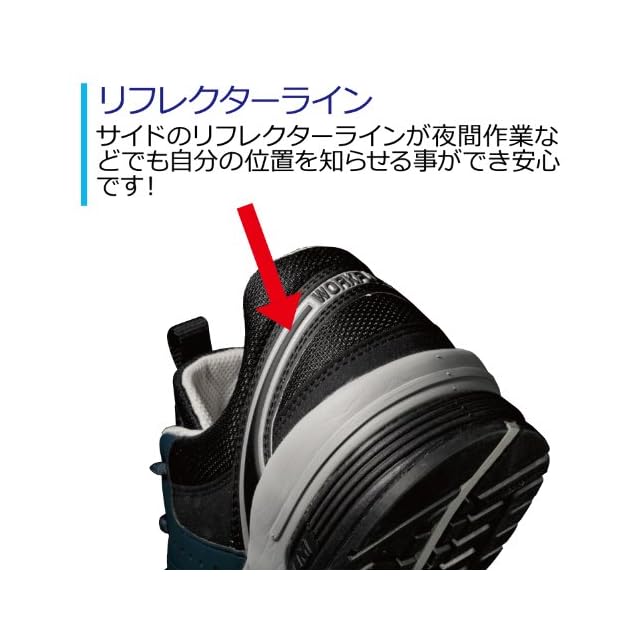 《ダブルクッションソール》硬度(柔らかさ)の異なるEVAクッションを2層構造にすることでかかとにかかる衝撃を吸収します。 《リフレクターライン》サイドのリフレクターラインが夜間作業などでも自分の位置を知らせる事ができ安心です。 《ワイド樹脂先芯》約4mmワイドで40g/足軽量化(当社比)を図った履きやすい樹脂製先芯を採用。鋼製先芯と同じ性能を持っています。 《ノンマーキング&耐油ゴムアウトソール》床を汚しにくいノンマーキング仕様。更に油に強い耐油ゴムソール。