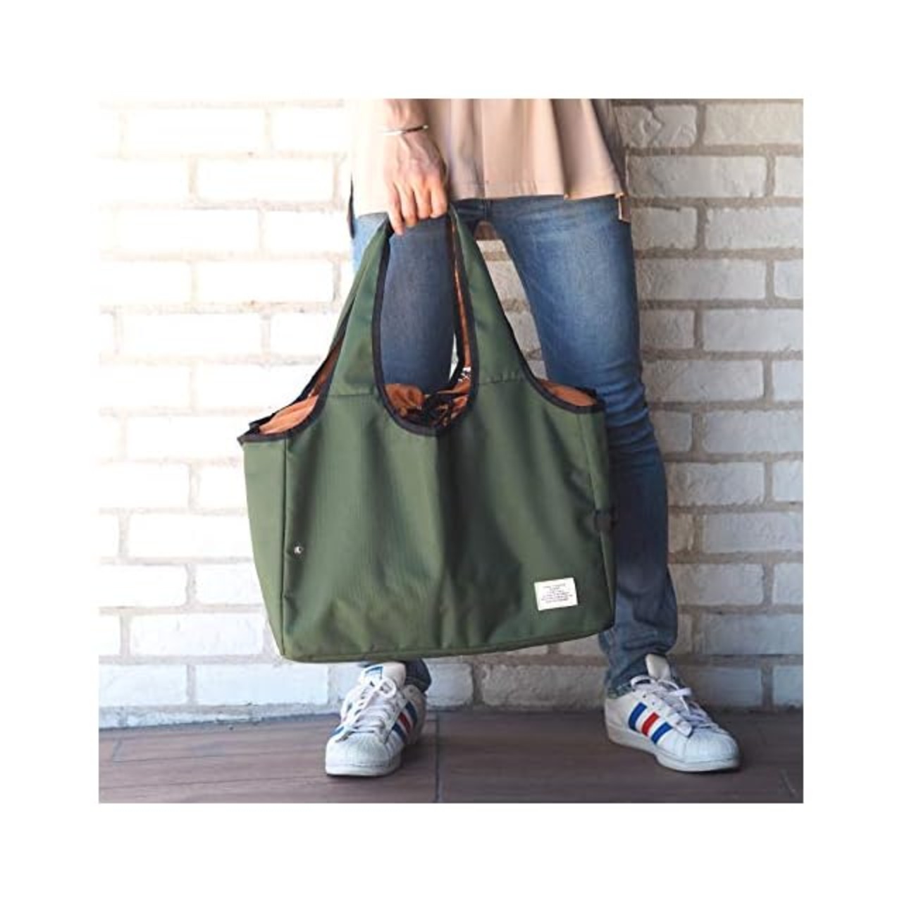 ①スーパーなどでお会計時にレジかごの中にセットすれば詰め替えせずにそのまま持って帰る事が出来ます。お買い物時の時短にも役立ちます! ②本体生地と内側の巾着生地がバイカラーにする事によりお買い物バッグもおしゃれに持つ事が出来ます。 ③バッグのハンドルもくり手のデザインで肩に掛けやすいでデザインになっておりハンドル上部にはPUレザーを使うことにより持ちやすくなっています。 ④内側にはアルミ蒸着シートを使用し保冷保温効果があります。