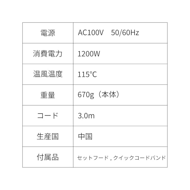 ✅ 本体質量:670g(フード別)。✅ 温風温度:115度(周囲温度30度の場合、フード無し、HIGH-温風時)。✅ 消費電力:1200W。✅ 電源:AC100V 50-60Hz。✅ コードの長さ:3.0m。✅ 風量切替:HIGH/LOW/OFF。✅ 即冷スイッチ:スライドロック式。✅ 期間:半年(6ヵ月)✅ 生産国:中国。