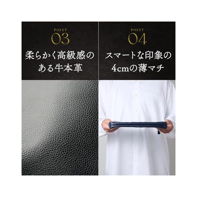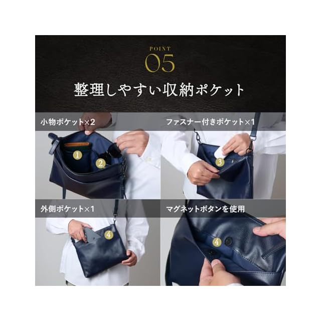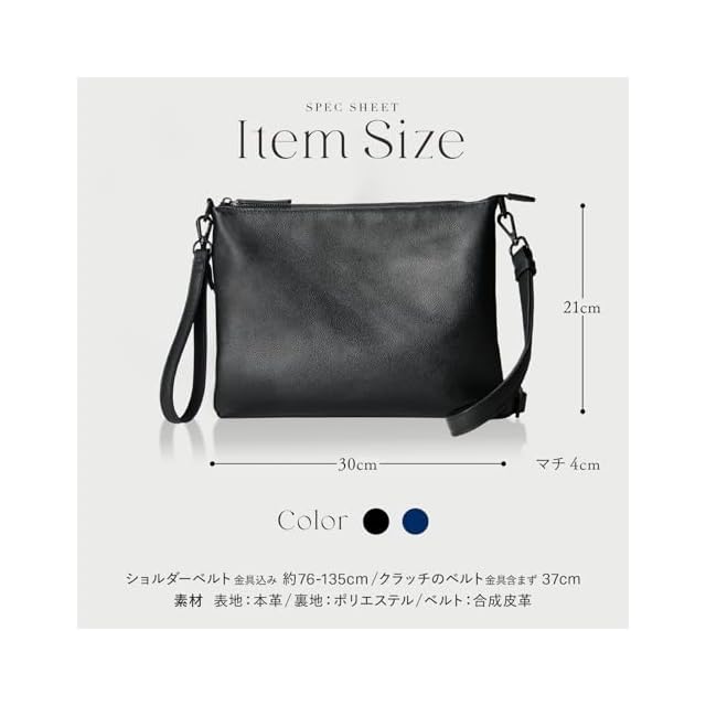 【選べるカラー】合わせやすいブラック、オシャレなネイビーの2色展開でご用意しています。 【スペック】素材 バッグ本体:牛本革 ベルト:合成皮革 サイズ:30cm×21cm×4cm ポケット 内側:小物ポケット×2 ファスナー付きポケット×1 外側:マグネット付きポケット