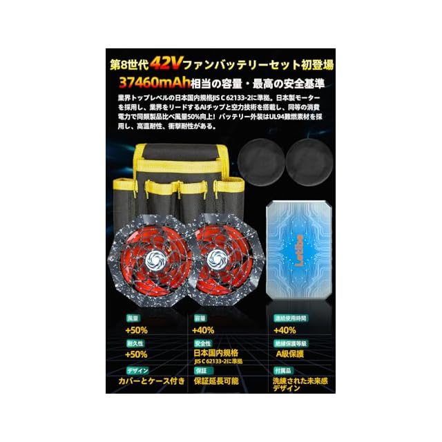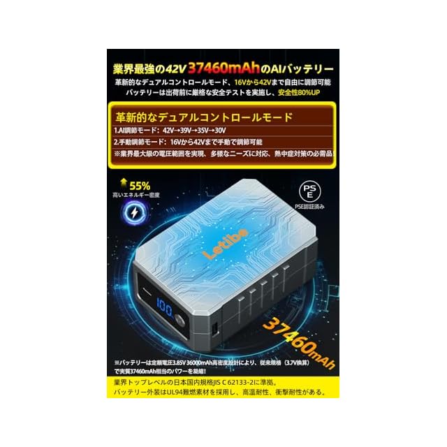 商品名:[Letibe] 【日本優良企業】 37460mAh 42V 最強空調作業服 ファンバッテリーセット 16Vから42Vまで調節可能 AI機能搭載 デュアルコントロールモード 30W超高速充電 発火防止アルミ加工 防塵カバー付き 作業用ツールバッグ付き付き 熱中症対策 90mm作業服穴径対応PSE認証済