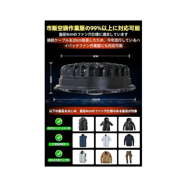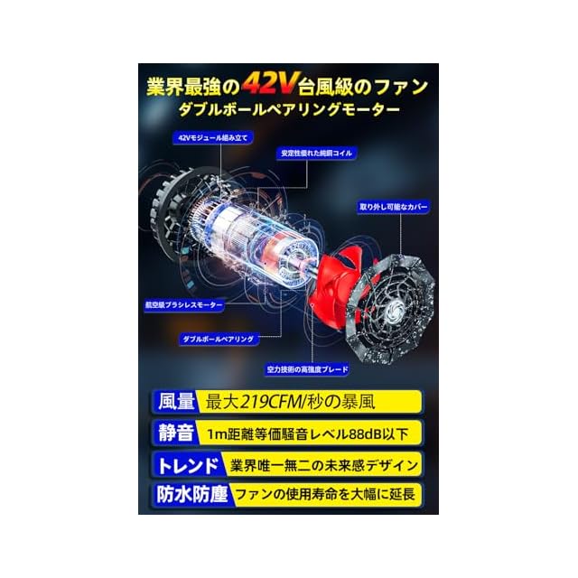 【業界最強風量×トレンドリーディングな多面体カバーデザイン】日本技術の核心であるダブルボールペアリングモーターに、IP45防塵防水仕様と42V高出力バッテリーを最適連動。従来品を凌駕する瞬間風量219CFM/秒を実現し、炎天下の作業現場からアウトドアアクティブまで、あらゆるシーンで瞬時に体感できる「肌に届く疾風」を約束します。デザイン面では唯一無二の多面体カバーを採用、市販全9cm取り付け穴径の空調作業着対応の汎用性を持ちながら、機能性とスタイリッシュの融合で、仲間から「それどこで買った?」の注目を独占。さらにメンテナンス面では革命的な進化を実現、着脱式構造でカバーの清掃やメンテナンスもラクラク!お客様の声に応えて付属されている接続コードを20cmロング化、さらに今年急成長中のハイバック型空調ウェア市場にいち早く対応!