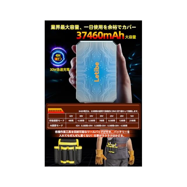 [Letibe] 【日本優良企業】 37460mAh 42V 最強空調作業服 ファンバッテリーセット 16Vから42Vまで調節可能 AI機能搭載 デュアルコントロールモード 30W超高速充電 発火防止アルミ加工 防塵カバー付き 作業用ツールバッグ付き付き 熱中症対策 90mm作業服穴径対応PSE認証済