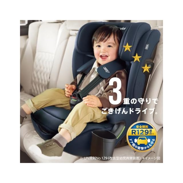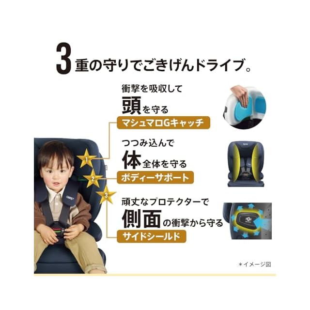 【3重の守り】マシュマロGキャッチ、ボディーサポート、サイドシールドで側面衝突に対応。R129適合。身長76cmから150cmまで使える。