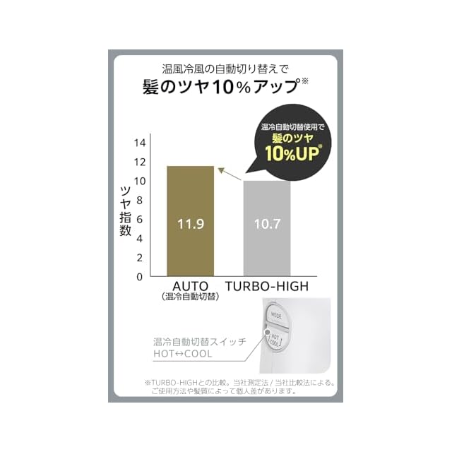 温度と風量を選べる2つのスイッチを搭載。乾きづらい根元は一気に乾かし、痛みの気になる毛先は低温でいたわりドライ。プロの乾かし方を再現して、サロン帰りのツヤ髪へ導きます。