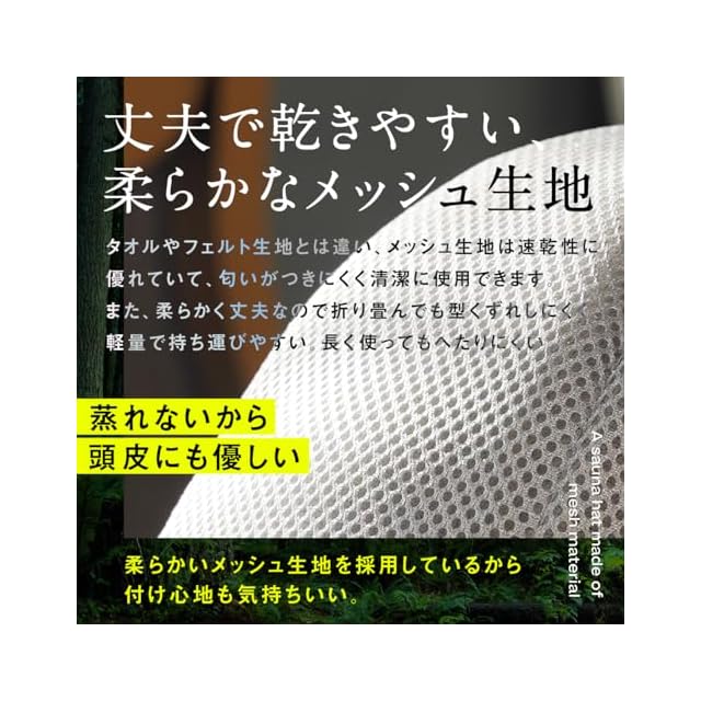 ✅メッシュ生地の2枚重ねのサウナハットでサウナ内でかぶることで頭ののぼせや、 髪へのダメージを減少してくれるアイテムです。✅速乾のメッシュ生地だから蒸れずに快適に過ごすことができます。✅【お手入れ】フェルトやウールハットと違い、洗濯機洗いでの簡単なお手入れで長く清潔にお使いいただけます。初めのうちは色落ちすることがありますので、洗濯ネットをご使用の上単独洗いをしてください。漂白剤、蛍光増白剤入りの洗剤は使用しないでください。生地の傷みを防止するため自然乾燥をオススメします。