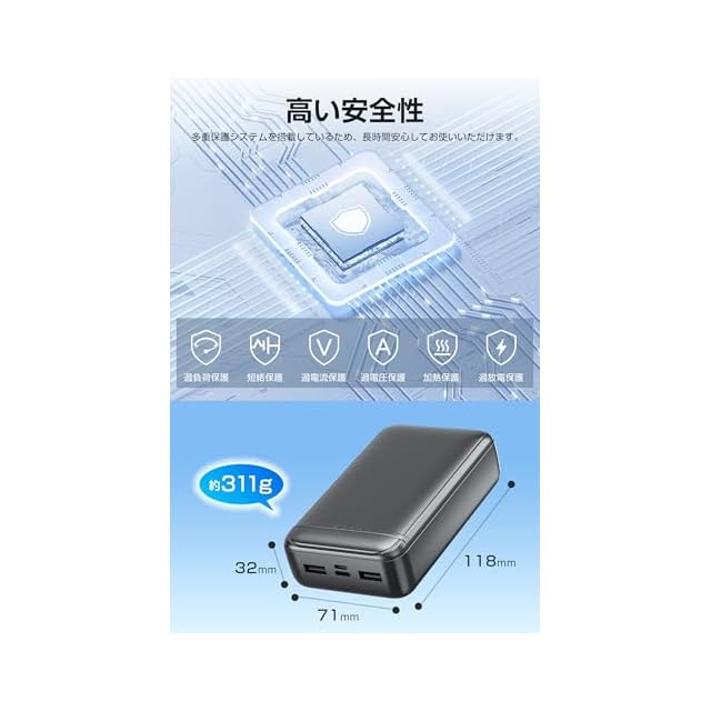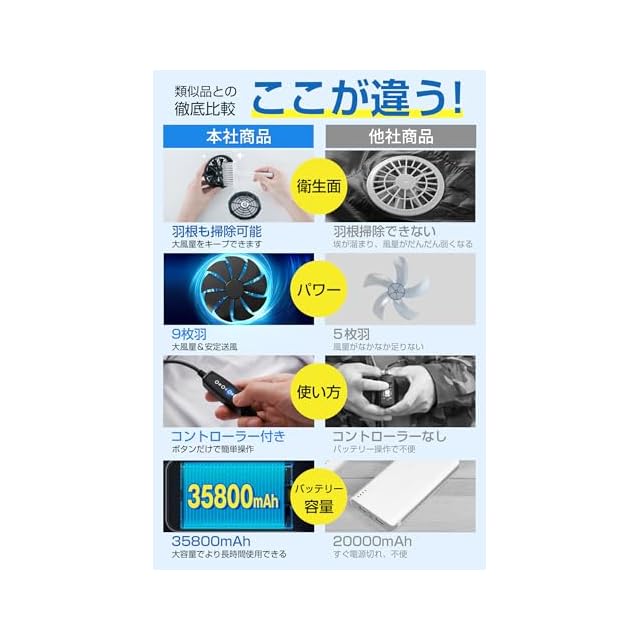【大容量モバイルバッテリー付属・一日中使える】35800mAh大容量バッテリー付、最大34時間*連続稼働できます。バッテリーに出力電圧5VのUSBポート搭載で、 空調ベスト ファンに給電以外、スマホ、携帯扇風機、Bluetoothイヤホン等のUSB機器に充電できます。PSE認証済みで安心にお使いいただけます。約312gの軽量デザイン、ポケットにスッキリ収納できるので、空調作業服に使うのはもちろん、どんなシーンにも大活躍します。(※ファン一個運転場合の最大使用時間です。※運転時間は着用条件・使用回数・充電回数などによって異なります。)