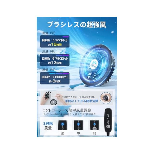 【強力送風・3段階風力調節】 空調作業服 は高性能ファン採用!9枚羽根&DCブラシレスモーター搭載で、強力かつムラの少ない風をお届けします。3段階風量調節でき、好みや体感によって切替できます。ファン一個約88gで極軽量!長時間使用しても負担になりません。