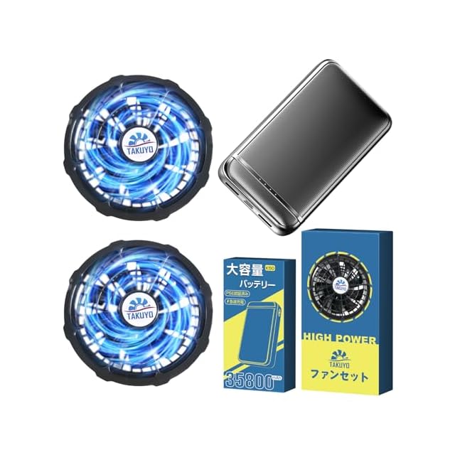 【空調作業服用ファンバッテリーセット】セット内容:ファンx2個(ファン取り付け穴9cmの空調ベストに適応しています。)、バッテリー(出力5V省エネモデル・容量35800mAh)、接続ケーブル、バッテリー用充電ケーブル。