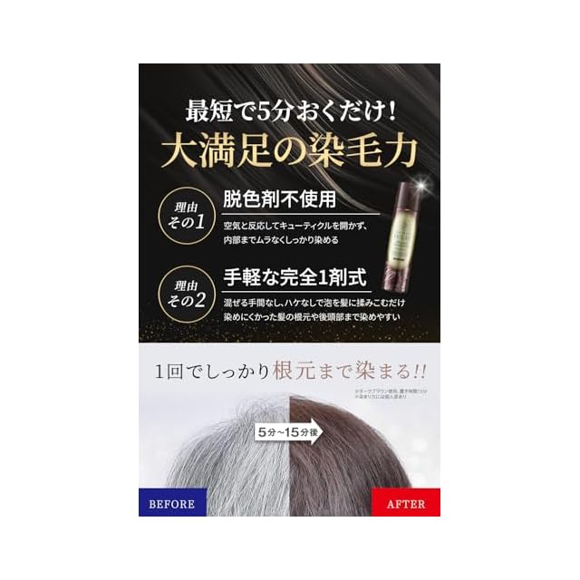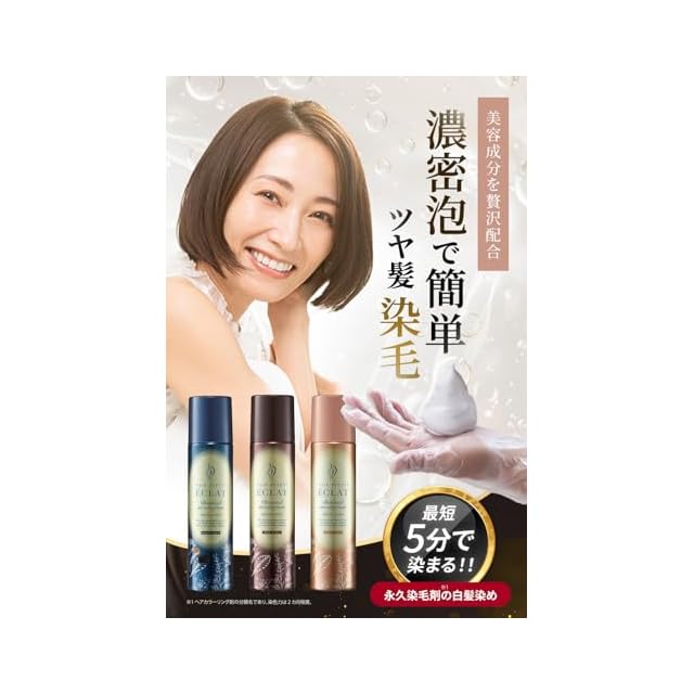大人気「空気で染める」カンタン手軽な白髪染めがリニューアル! 「ヘアボーテエクラ ボタニカルエアカラーフォームEX」は、ワンプッシュでムースを出し、髪になじませて5分置くだけで白髪をムラなくつややかに染め上げます。脱色剤を一切使用しない処方で髪を傷めにくい処方はそのままに、ハリ・コシ成分として加水分解ケラチンを配合。ダメージ髪をケアし、色持ちアップにも。もちろん、うるおいを与えるボタニカル成分や10種の和漢植物エキスも配合、ツヤとうるおいを与えて美しく輝く美髪を育みます。 さわやかなフレッシュグリーン香りで、ツンとくる刺激臭も気にならず、ストレスなくホームカラーリングをお楽しみいただけます。