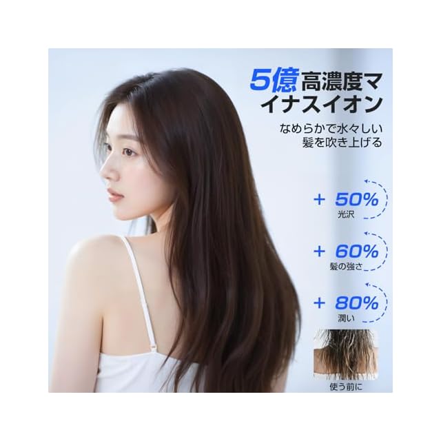 「5億マイナスイオン革命!髪の常識を変える至高のドライ体験」 5 億個のマイナスイオンが風の幕を作り、1 本 1 本の髪を優しく包みます。夏はカール整え、冬は静電気防止で四季ケア。スマート温風で高温も頭皮を傷めず、低温でもしっかり乾きます。指触れる瞬間シルクのようななめらかさを味わえます。コンパクトデザインで、いつでもプロ級のスタイリングが手軽に!
