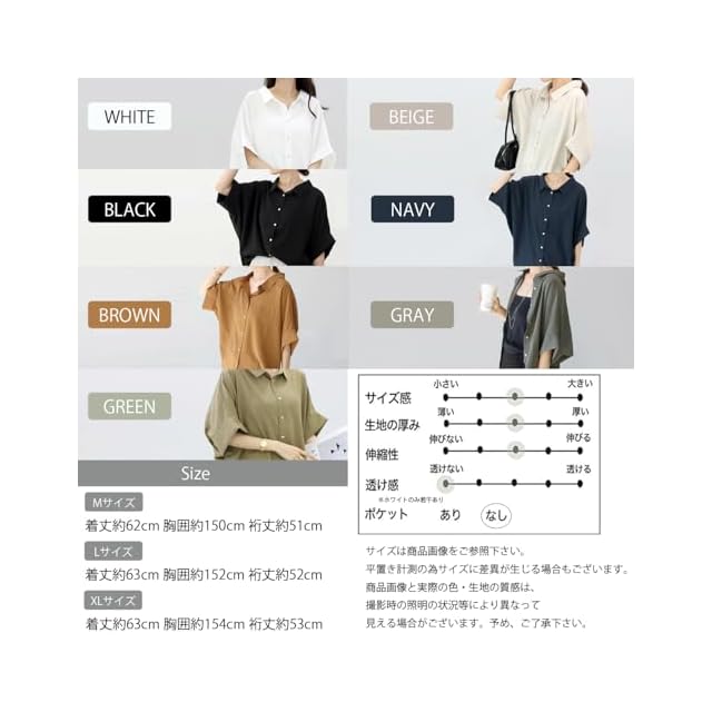 薄手ながらも透けづらいから、1枚で着るのはもちろん、キャミソールやタンクトップのインナーと上着として合わせたりジャケット・Gジャン・パーカー・コートなどの上着・アウター類とも合わせやすい。