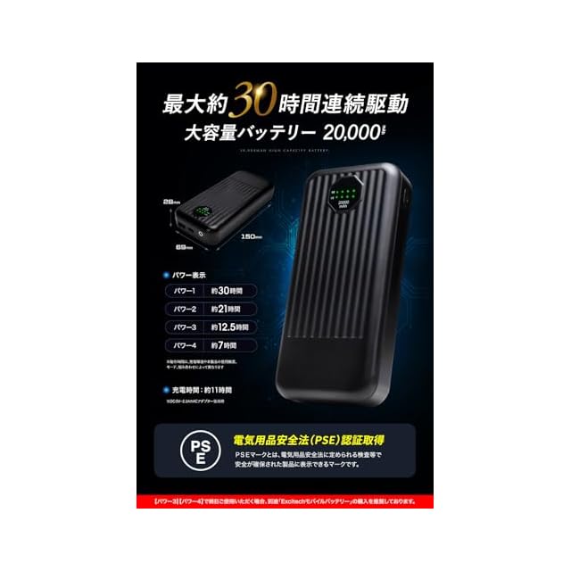 ✅【セット内容】ベスト・ファン・モバイルバッテリー・ケーブル・USBコード・取扱説明書(書つき)※本商品にはACアダプターは付属されておりません。 【について】はお買い上げ日より6ヵ月間です。 ※修理・交換の際には書の提示が必要となりますので大切に保管していただきますようお願い申し上げます。 ※EXCITECH COOL VEST専用のファン、バッテリーを必ずご使用ください。他社製品と組み合わせて使用しないでください。(期間内でも弊社専用機器以外を接続したことによる故障は対象外となります。) ※モバイルバッテリーを充電する際に、定格電源:5V⎓2.1A以上のものをお使いになられて故障した場合や、EXCITECH COOL VEST以外の製品に使用され故障した場合は、期間内でも対象外となります。 ✅【PSE認証取得済み】Excitech(エキサイテック)は、安心安全のPSE認証取得済みです。PSEとは電気用品安全法の基準に適していることを示す表示マークです。