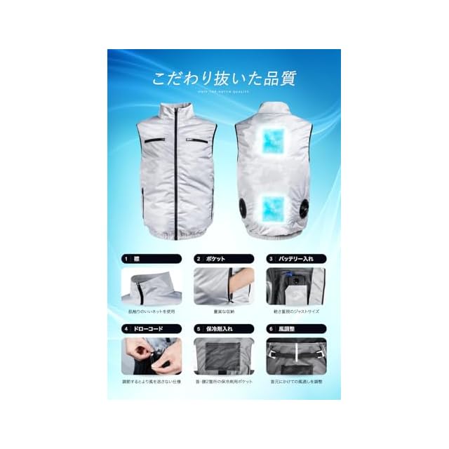 ✅【ファン付きベスト】裏チタンコーティング/撥水加工のため水を弾き、紫外線・赤外線をUVカット仕様です。 風漏れを防止する「チタン加工」と「ドローコード」を調節することで衣服内部の風がさらに逃げにくく、熱中症対策や作業効率のUPに努めます。 背中から首筋へと伝わる、爽風をご体感ください。 また、ファスナーは高品質・耐久性のものを使用し、保冷剤入れは首・腰の2箇所、豊富なポケットと服裏面にペン差しスペースをご用意しております。