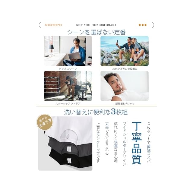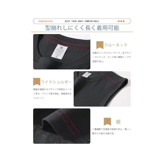 <p><b>[SHOREKEEPER] 6.2オンス タンクトップ メンズ 3枚セット 5枚組 Tシャツ ノースリーブ インナーシャツ 綿 夏服 広い肩 ヘビーウェイト ゆったり 吸汗速乾 スポーツウェア 通気性 フィットネス 春 夏 秋 冬</b></p> <ul> <li>素材: 50% コットン, 50% ポリエステル</li> <li>適用対象:メンズ</li> <li>サイズ:M、L、XL、2XL、 3XL</li> <li>季節に適しています:春、夏、秋、冬</li> </ul> <ul> <li>「サイズ選びの重要ポイント」※本品は日本サイズ比1サイズ小さく作られています(例:Lサイズ=日本M相当)。普段Mサイズをお使いの方はLサイズをご選択ください。推奨体重表を必ずご確認いただくか、ゆとりある着用感をお求めの場合は、さらに1サイズアップをおすすめします。</li> <li>「オールシーズン活躍!ワイドショルダーベスト」6.2ozの中厚生地は夏の単品着用に適した透け防止機能と、春秋冬のインナーとしての保温性を両立。摩擦に強い高密度編み構造で、洗濯繰り返しにも耐えるロングライフ設計です。 </li> <li>「衛生的!個別包装3枚組/5枚組」各商品を個別パッケージ化。未使用時は清潔な状態を保ち、外出先での着替えや収納・贈り物にも便利です。3枚組は休日用に、5枚組はビジネスデイから週末まで、洗濯頻度を減らす効率的なローテーションを実現。コスパと品質のバランスが支持される人気セットです。 </li> <li>「シーンを選ばない万能スタイリング」無地デザインとシンプルシルエットが、カジュアルからビジネスカジュアルまで幅広いコーデをサポート。M~3XLの全サイズ展開で、カップルや家族でのお揃いコーデも可能。ジムでのトレーニングはもちろん、買い物やオフィスでのインナーとしても違和感なくフィットします。</li> <li>「丁重に声明する」購入後30日以内に、ご不満があった際は、返品・返金対応いたします。弊社が数年前から服を販売していますが、弊店にすべての商品は実物をそのままで撮影したので、ご安心して買いていただくようお願い申し上げます。</li> </ul>