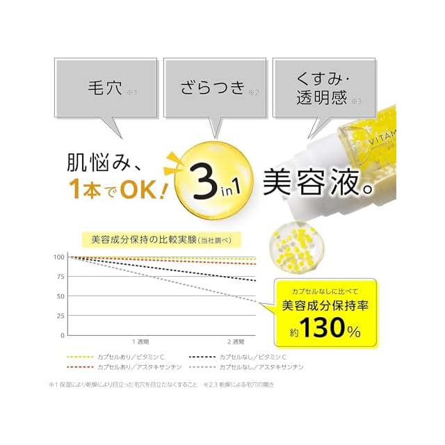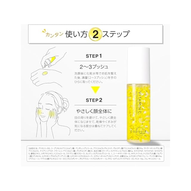 ブランド名:カプセルセラム(CAPSULE SERUM) はじけてうまれる、生美容液。 ー独自カプセルが、成分本来のチカラを引き出す新・美容液ー ①生ビタミンC※1×ビタミンC誘導体※2のWビタミンC処方 ②4種類のビタミンC誘導体を厳選配合 ③浸透型※3ビタミンC誘導体※2がさまざまな肌悩みに多角的にアプローチ ④コラーゲン、ヒアルロン酸、3種類のセラミド、ナイアシンアミド、ツボクサエキス(CICA)、フラーレン等11種類の整肌成分を同時に配合 ⑤毛穴※4、ざらつき※5、くすみ・透明感※6もコレ1つで。3in1美容液。 ※1アスコルビン酸(酸化防止剤) ※2アスコルビルグルコシド、テトラへキシルデカン酸アスコルビル、パルミチン酸アスコルビルリン酸Na、3-グリセリルアスコルビン酸 すべて酸化防止剤 ※3角質層まで ※4乾燥による毛穴の開き ※5、6乾燥による