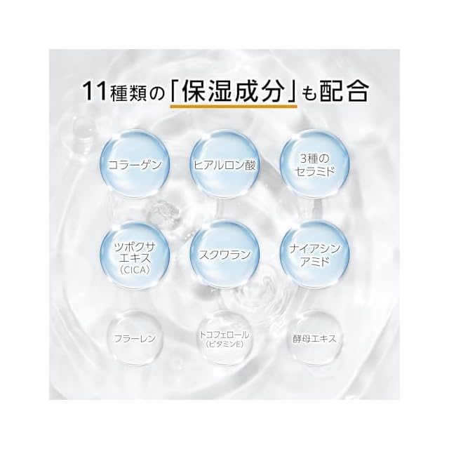 コラーゲン、ヒアルロン酸、3種類のセラミド、ナイアシンアミド、ツボクサエキス(CICA)、フラーレン等11種類の整肌成分を同時に配合