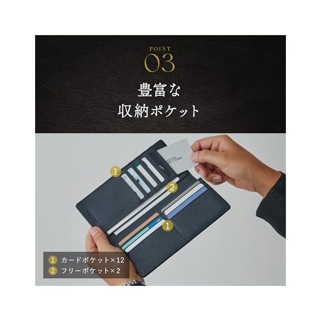 【商品スペック】■収納:札入れ×1,小銭入れ×1,カードポケット×12,フリーポケット×2/■サイズ:縦9.5cm×横19.5cm×幅2.3cm