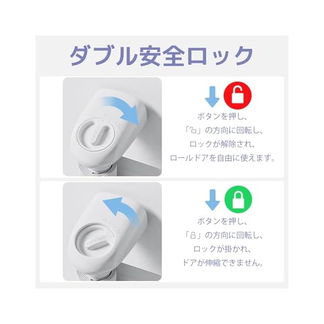 ❀❀安全ロック設計:安全ロック機能は操作が簡単で、片手でベビーゲートを開けることができます。ボタンを押し、ロックアイコンの方に回すと、メッシュゲートバーがロックされ、伸縮できなくなります。ロック解除アイコンの方に回すと、メッシュゲートバーのロックが解除され、通常通り伸縮できるようになります。ゲートバーをフックにかけた状態で、セーフティロックをロック位置までひねると、メッシュ生地が動かなくなります。幼児が誤って触れるのを防ぎます。