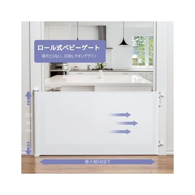 UNNIK ベビーゲート ロール式 【ネジ付け可&貼り付け可】 幅140CM ペットゲート ベビーゲート 階段上 巻き取り式 階段ゲート 格納式 安全ロック機能 赤ちゃん/ペット/猫/犬に適応 日本語取扱説明書付き (ホワイト, 最大幅140cmx高86cm)