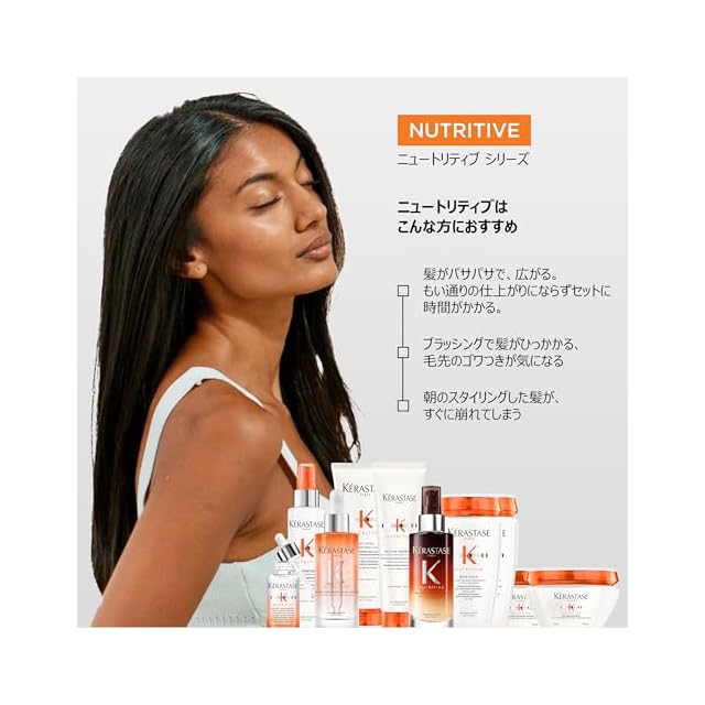 ニュートリティブはこんな方におすすめ ●髪がパサパサで広がる ●毛量が多いことに悩んでいる ●毛先のゴワつきが気になる ●朝にスタイリングした髪がすぐに崩れてしまう ●さらなる乾燥を恐れて、カラーやパーマの施術を受けることを躊躇している